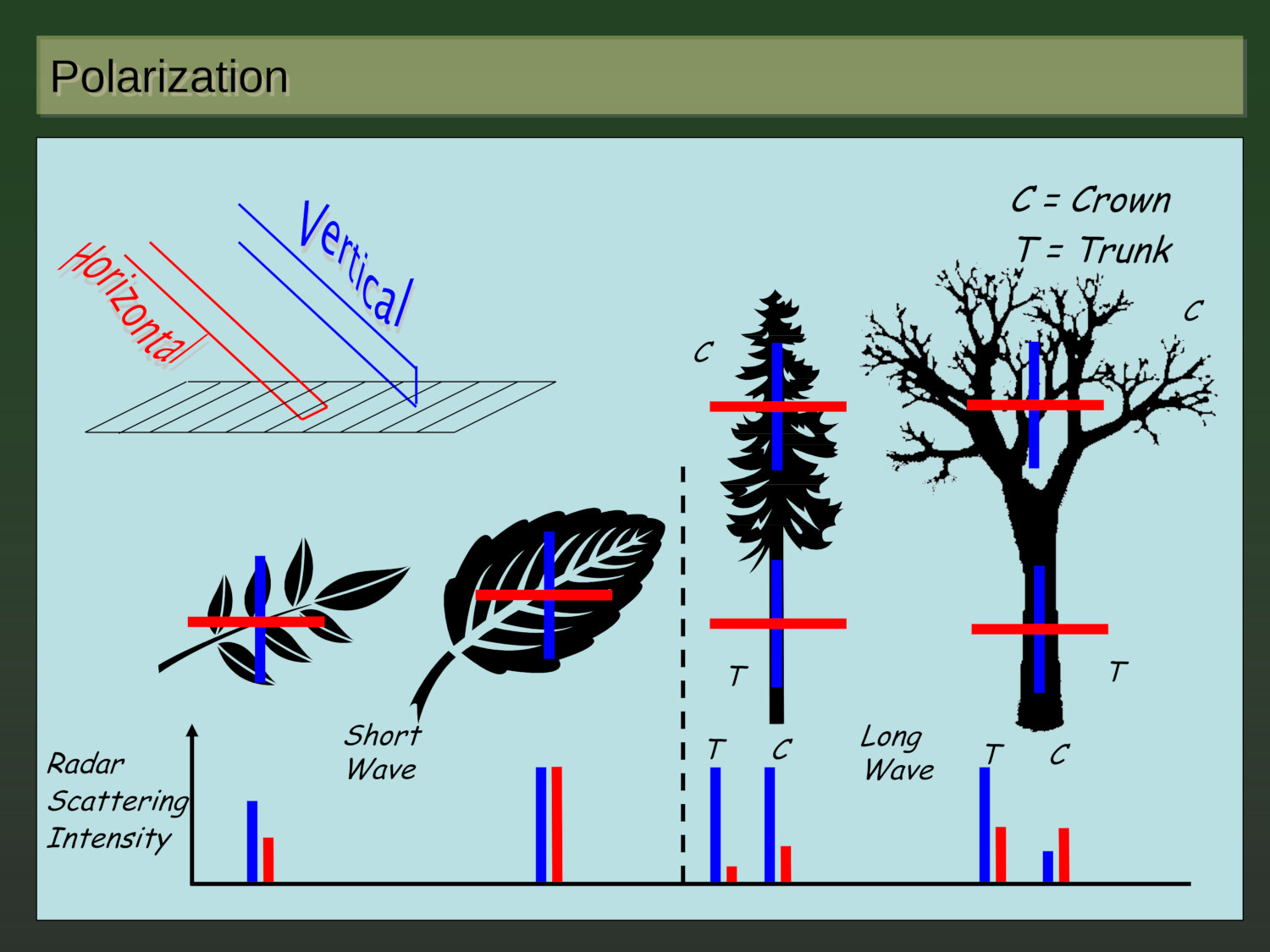 As noted before, a radar signal is a mix of four flavours: VV, VH, HH, HV (see also the polarization matrix below). The components on the diagonal, VV and HH, are called co-polarized, while those off-diagonal, VH and HV, are called cross-polarized. The strength of these components depends on the shape of the surface/object that the radar signal interacts with, as demonstrated in Fig. 6. For instance, tree trunks, which are mainly oriented vertically, reflect mainly the vertically polarized wave strongly, and vice versa. Objects (or parts thereof) that do not have a preferred orientation (e.g. round leaves) or are distributed in random orientations, return both V and H polarization in equal strength.