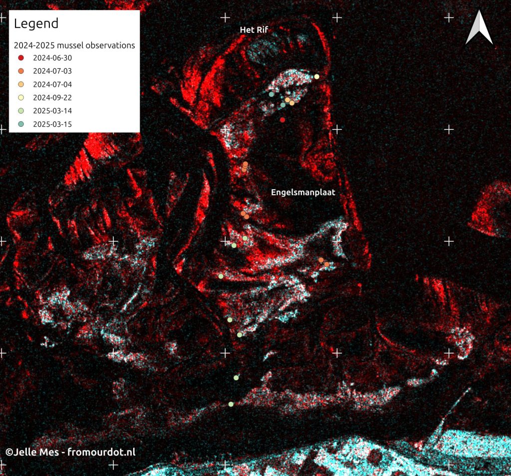 In 2024 a large increase in young mussels (Mytilus edulis) was observed in the Dutch Wadden Sea. Mapping these reefs is time-consuming and cannot be done on a regular basis. Therefore we adapt a remote-sensing based approach to automate this process, which enables monthy observations. We also give a detailed background on the utilized synthetic aperture radar (SAR) techniques. This method is subsequently used to map reefs around the supratidal shoal Engelsmanplaat – we find a 25 fold increase in reef area in 2024 (see animation) This method can be readily applied to larger parts of the Wadden Sea, allowing for frequent & reliable measurements on the distribution and size of mussel reefs.