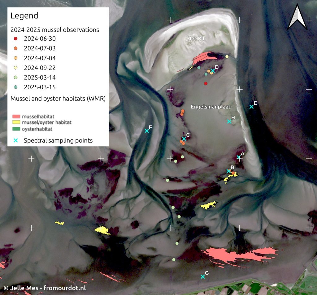 In 2024 a large increase in mussel population was observed throughout the Dutch Wadden Sea . One specific region where this occurred is the Engelsmanplaat, a supratidal shoal between the islands of Ameland and Schiermonnikoog, located in the Frisian Inlet. Volunteers of Staatsbosbeheer saw young (~5 mm) mussels spread over large areas near the tidal channels at the edge of the shoal. Fig. 2 shows the spread of mussel observations around the Engelsmanplaat compared to the up to then known location of mussel reefs (which in 2023 covered an area of roughly 11 hectares).