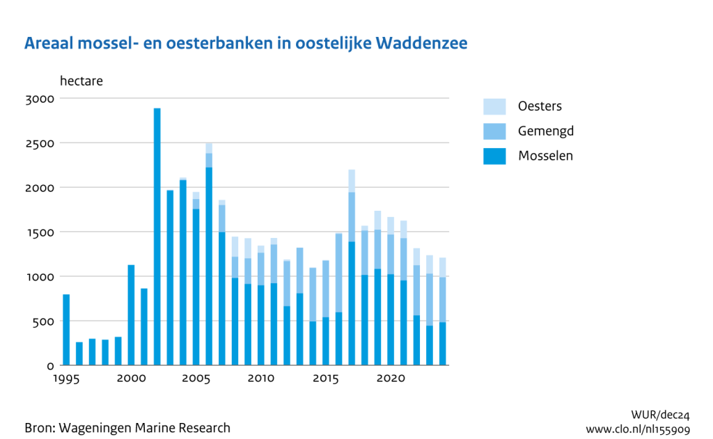 Regarding the development of the mussel reefs themselves, a large unknown is whether the new reefs will be stable in the coming years. Survival rates are generally poor: around 50% after the first winter and dropping to 20% after 6 winters compared to the first year . However, even with a 20% survival rate, the peak of ~200 ha in October-December 2024 would be reduced to ~40 ha over 6 years, a 4 fold increase in area compared to 2023.