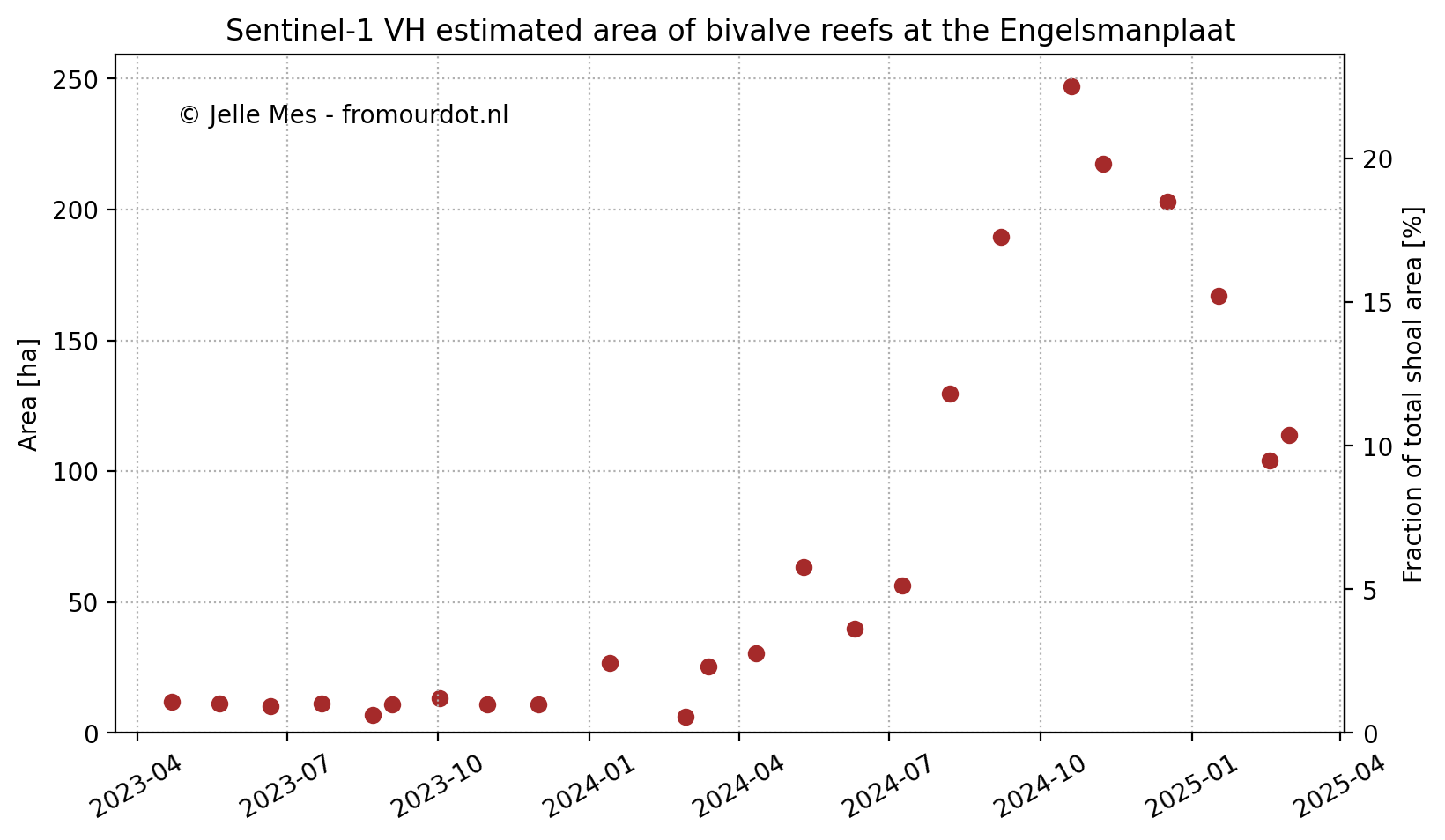 The estimated reef area at the start of 2023 is a bit lower than that reported by WMR, shown in Fig. 2: ~14 hectares. These measurements do not take gaps in the middle of the reefs into account, the polygons are outlines of the reefs only. This explains the lower reef area from the SAR method presented here. The start of the explosive growth in Fig. 10 around July 2024 coincides with the first sightings from the volunteers of Staatsbosbeheer , see also Fig. 3 and 4. It is suspected that at this stage the mussels became large enough to be picked up by the C-band radar, being around 6 to 10 mm in size. This aligns with the primary length-wise growth period for mussels between april and august . Around half of the new mussel reefs do not survive the winter of 2025, matching winter survival rates from the literature, usually around 60% .